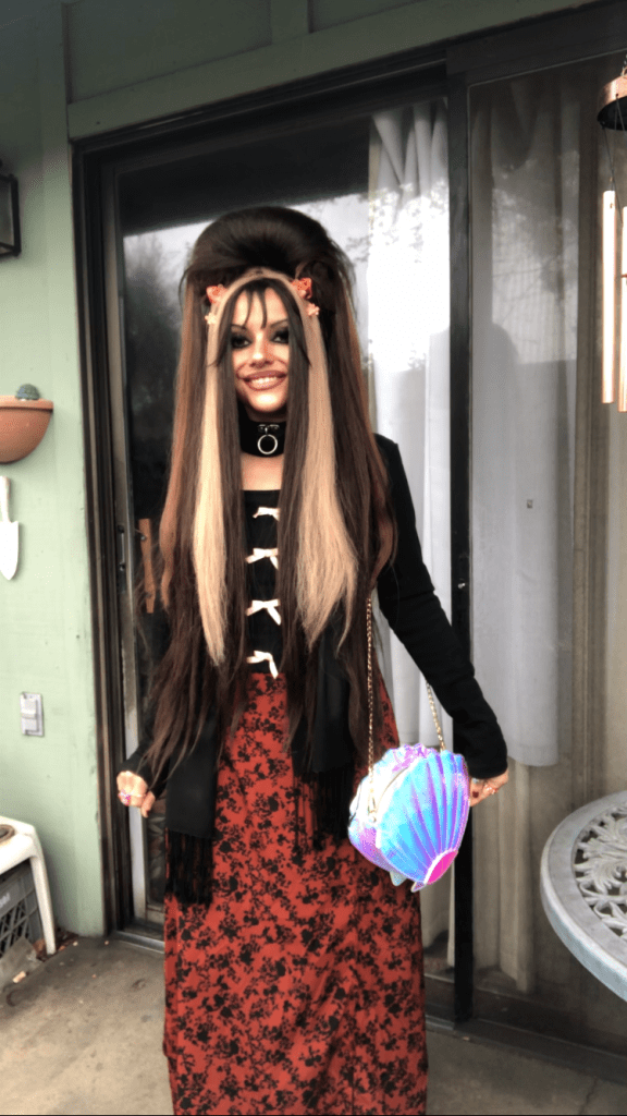 Pairing it with my new iridescent seashell purse I got off of Poshmark, I thought it turned out to be a very fun look with my orange cat ear clips and frilly white socks! I’m enamored with the beautiful shades of colors in the purse. π