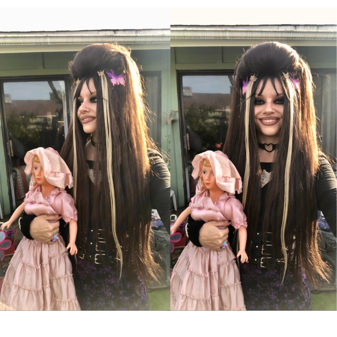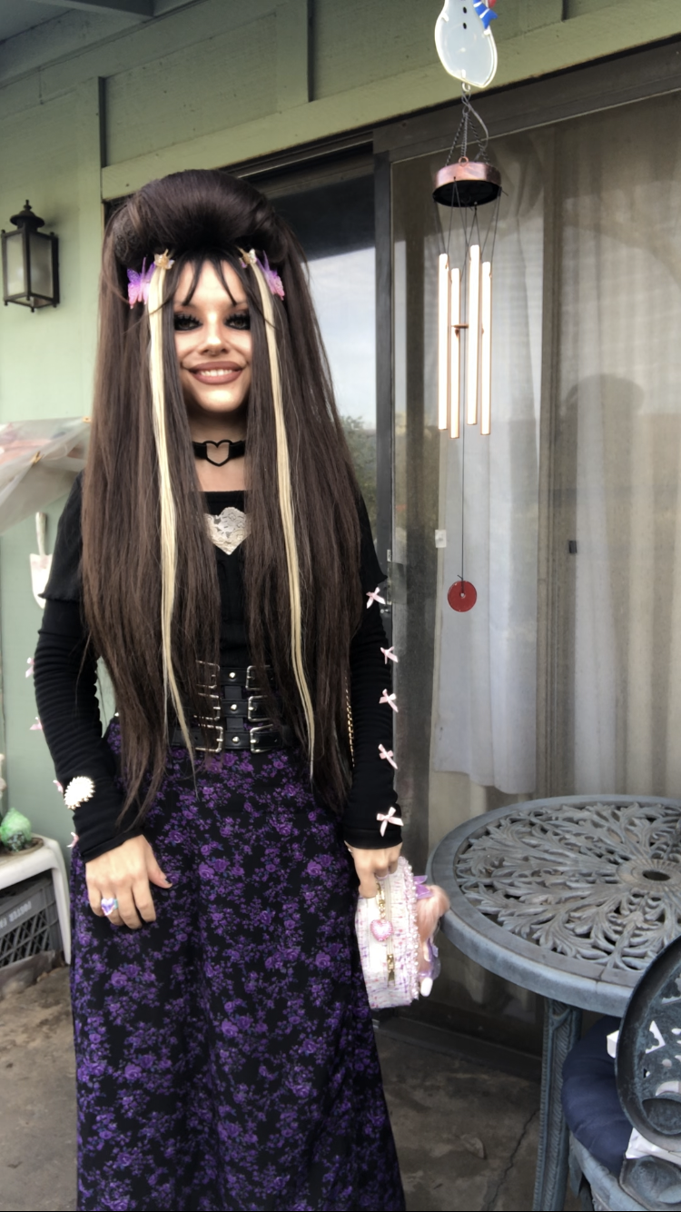 Black and purple is such a striking combination, I think. 💜🖤 I played up the purple with my pink-and-purple butterfly hair clips and purple rose barrette I wore in the back of my hair!