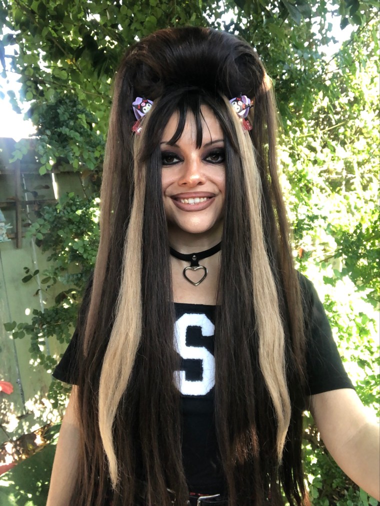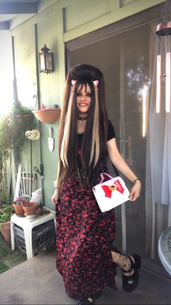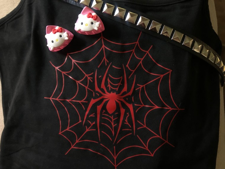 I thought it would be cool to own a spider shirt, just because it adds a creepy touch. To offset that, Hello Kitty cat ears, a Sailor Moon purse and a matching black and red skirt complete the creepy-cute look!