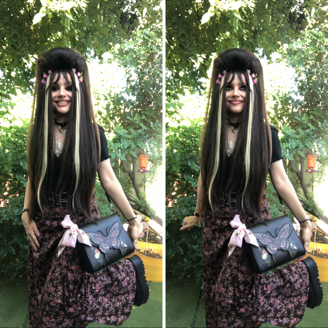 Choosing a brown, pink and black color theme for my outfit, I went with butterflies, roses and bows for my accessory accents. Tying a light pink butterfly scarf to my purse, I thought it added a chic element! βοΈ π